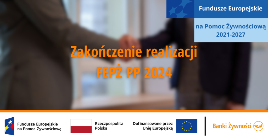 Informujemy, iż dystrybucję artykułów spożywczych w ramach FEPŻ PP 2024 należy zakończyć z dniem 30 listopada 2025 r. W tym terminie zakończy się również realizacja działań towarzyszących.